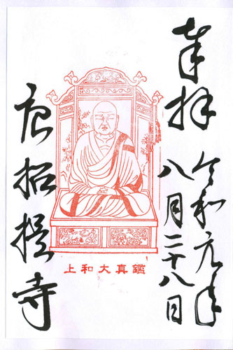 Abb. links: Kyoto, Chion-in, Hauptstempel, Mönch Honen ("Honen Shonin"), rechte Spalte unten: Datum: 27.8.2019 = Reiwa 1 nen hachi-gatsu ni-juu-shichi-nichi. Abb. rechts: Kyoto, Chion-in, Vers des Chion-in: "The lone evergreen pine amongst the barren field as if to symbolize the original vows of the Amida Buddha" - "Die einsame immergrüne Kiefer inmitten des kargen Feldes als Symbol für die ursprünglichen Gelübde des Amida Buddha", Datum: 27.8.2019 = Reiwa 1 nen hachi-gatsu ni-juu-shichi-nichi.