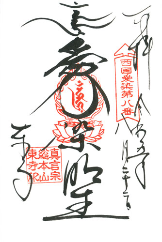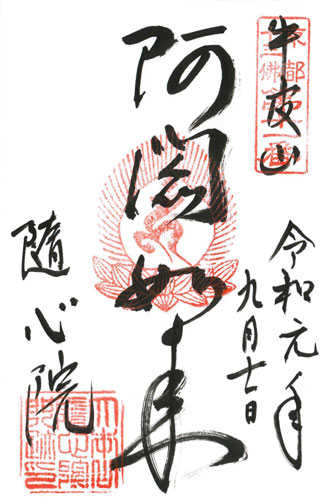 Abb.: links: Kyoto, Stadtteil Yamashina, Zuishin-in, linke Spalte: Zuishin-in, mittlere Spalte: Ashuku Nyorai (wegen 11. Tempel des Pilgerweges Kyoto jusan butsu reijo), rechte Spalte unten: Datum: 11.9.2019 = Reiwa 1 nen ku-gatsu juu-ichi-nichi. Abb. rechts: Kyoto, Tempel To-ji (Tou-ji), Halle für Kobo Daishi, Daishido = Mieido, Mittelspalte: Kobo-Daishi, rechte Doppelspalte unten: Datum: Di, 22.8.2023 = Reiwa 5 nen hachi-gatsu ni-juu-ni-nichi. Linke Spalte: To-ji.