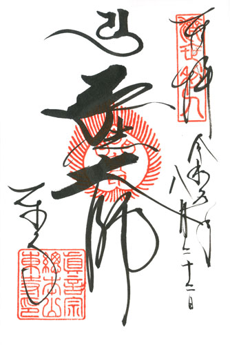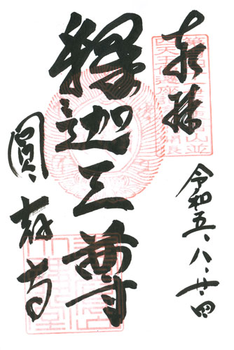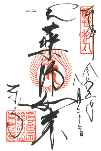 Abb.: links: Bitchu Takahashi, Präfektur Okayama, Tempel Raikyu-ji, rechte Doppelspalte unten: Datum: Sa, 26.8.2023 = Reiwa 5 nen hachi-gatsu ni-juu-roku-nichi. Abb. rechts: Takao, Dorf im Norden von Kyoto, Tempel Saimyo-ji, Mittelspalte: Shaka Nyorai, am Anfang steht noch zusätzlich das Sanskrit-Zeichen für "Baku", linke Doppelspalte oben: Datum: So, 27.8.2023 = Reiwa 5 nen hachi-gatsu ni-juu-shichi-nichi.