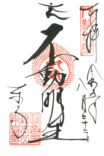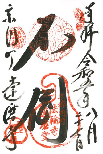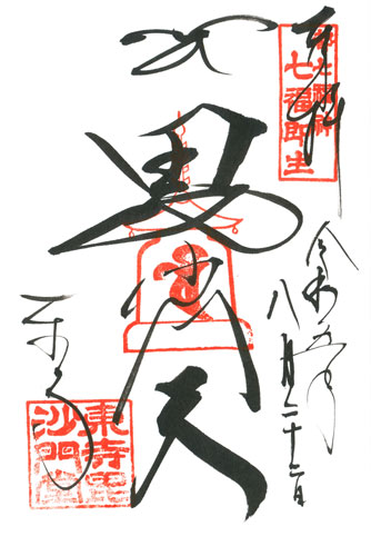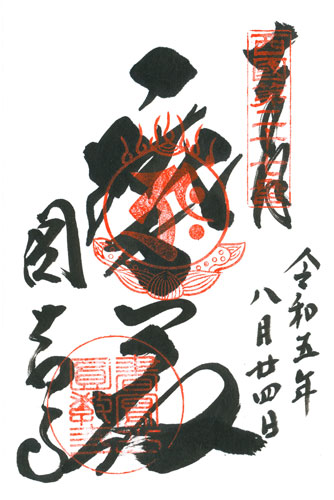Abb.: links: Kyoto, Tempel To-ji (Tou-ji), Bishamon-Halle, Bishamondo (1), Mittelspalte: Bishamon-ten, rechte Doppelspalte unten: Datum: Di, 22.8.2023 = Reiwa 5 nen hachi-gatsu ni-juu-ni-nichi. Der rote Stempel rechts oben bezieht sich darauf, daß die Figur Teil eines siebenteiligen Pilgerweger der sieben Glücksgötter von Kyoto (Miyako Shichifukujin) ist; man erkennt nebeneinander zweimal das Kanji für die Zahl 7. Linke Spalte: To-ji. Abb. rechts: Kyoto, Tempel To-ji (Tou-ji), Lehrhalle Kodo (2), Mittelspalte: Fudo Myo-o, rechte Doppelspalte unten: Datum: Di, 22.8.2023 = Reiwa 5 nen hachi-gatsu ni-juu-ni-nichi. Linke Spalte: To-ji.