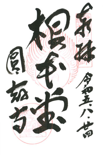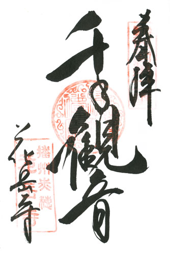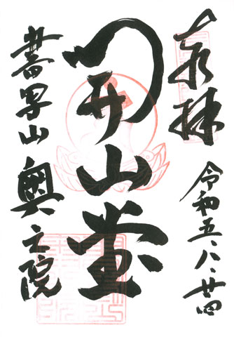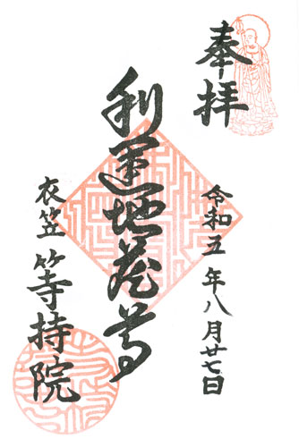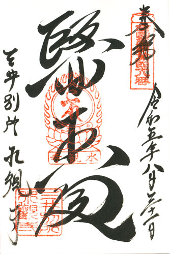 Abb.: links: Hikone, Präfektur Shiga, Tempel Ryotan-ji, rechte Doppelspalte unten: Datum: Mi, 23.8.2023 = Reiwa 5 nen hachi-gatsu ni-juu-san-nichi. Abb. rechts: Himeji, Präfektur Hyogo, Tempel Engyo-ji, Halle Maniden, rechte Doppelspalte unten: Datum: Do, 24.8.2023 = Reiwa 5 nen hachi-gatsu ni-juu-yokka. Dieses Goshuin bezieht sich darauf, daß die Halle mit der Figur einer Kannon mit wunscherfüllendem Juwel (Nyoirin Kannon) die Station Nr. 27 des insgesamt 33 Stationen umfassenden Pilgerweges Saikoku Sanjuusansho darstellt. Man erkennt im rechten oberen Stempel nacheinander die Zahlzeichen 2 x 10 + 7 = 27.