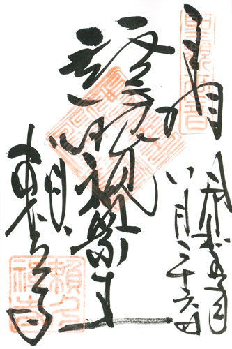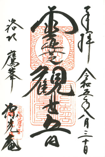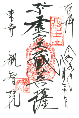 Abb.: links: Kyoto, Takagamine, Tempel Koetsu-ji, mittlere Spalte typisch für Nichiren-Tempel, Namu-myoho-renge-kyo, beide rechten Spalten: Datum: Mi, 30.8.2023 = Reiwa 5 nen hachi-gatsu san-juu-nichi. Linke Spalte: Taikyo-san Koetsu-ji. Abb. rechts: Otsu, Präfektur Shiga, Tempel Miidera (Onjo-ji), Halle Kannon-do, Mittelspalte: Nyoirin Kannon, rechte Spalte unten: Datum: Do, 31.8.2023 = Reiwa 5 nen hachi-gatsu san-juu-ichi-nichi. Der Mii-dera ist ein Wallfahrtsort auf dem ca. 1300 km langen Saigoku-Pilgerweg (Saigoku sanjuusankasho), wo er die vierzehnte von insgesamt 33 Stationen darstellt. Linke Spalte: Mii-dera.