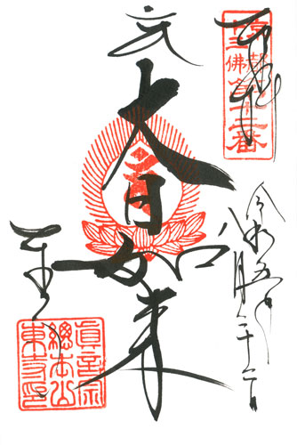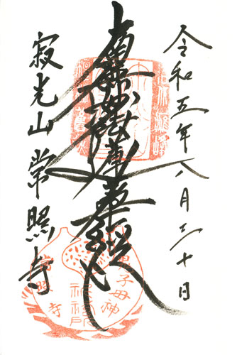 Abb.: links: Kyoto, Takagamine, Tempel Josho-ji, mittlere Spalte typisch für Nichiren-Tempel, Namu-myoho-renge-kyo, rechte Spalte: Datum: Mi, 30.8.2023 = Reiwa 5 nen hachi-gatsu san-juu-nichi. Linke Spalte: Jakukou-san Joushou-ji. Abb. rechts: Kyoto, Takagamine, Tempel Genko-an, mittlere Spalte: Reishi-Kanzeon, rechte Spalte unten: Datum: Mi, 30.8.2023 = Reiwa 5 nen hachi-gatsu san-juu-nichi.