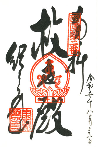 Abb.: links: Takao, Dorf im Norden von Kyoto, Tempel Kozan-ji, Mittelspalte: Shaka Nyorai, rechte Spalte unten: Datum: So, 27.8.2023 = Reiwa 5 nen hachi-gatsu ni-juu-shichi-nichi. Linke Spalte unten: Kozan-ji. Rechte Spalte unten: Bergname: Toganoo-san. Abb. rechts: Wakayama, Präfektur Wakayama, Tempel Kimii-dera, rechte Spalte unten: Datum: Mo, 28.8.2023 = Reiwa 5 nen hachi-gatsu ni-juu-hachi-nichi. Der obere rechte rote Stempel mit der Zahl 2 erinnert daran, daß die hier verehrte elfköpfige Kannon (Juuichimen Kannon) die Station Nr. 2 auf dem Saigoku-Kannon-Pilgerweg ist.