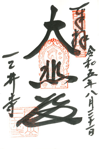 Abb.: links: Himeji, Präfektur Hyogo, Tempel Engyo-ji, Halle Daikodo (1), erstes von insgesamt drei Goshuin, rechte Spalte unten: Datum: Do, 24.8.2023 = Reiwa 5 nen hachi-gatsu ni-juu-yokka. Abb. rechts: Himeji, Präfektur Hyogo, Tempel Engyo-ji, Halle Daikodo (2), zweites von insgesamt drei Goshuin, rechte Spalte unten: Datum: Do, 24.8.2023 = Reiwa 5 nen hachi-gatsu ni-juu-yokka.
