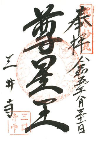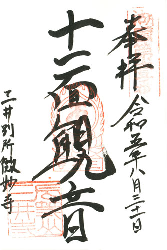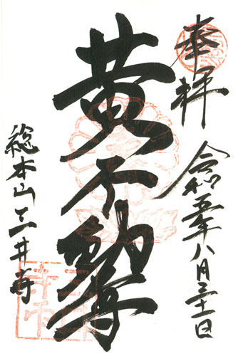 Abb.: links: Otsu, Präfektur Shiga, Tempel Miidera (Onjo-ji), Bimyo-ji, erstes Goshuin von dreien, Mittelspalte: Sonjou-ou, rechte Spalte unten: Datum: Do, 31.8.2023 = Reiwa 5 nen hachi-gatsu san-juu-ichi-nichi. Linke Spalte: Mii-dera. Abb. rechts: Otsu, Präfektur Shiga, Tempel Miidera (Onjo-ji), Bimyo-ji, zweites Goshuin von dreien, Mittelspalte: Juuichimen Kannon, denn im Subtempe Bimyo-ji wird eine elfköpfige Kannon verehrt; sie ist der Startpunkt der Kokoku-Kannon-Pilgerroute, rechte Spalte unten: Datum: Do, 31.8.2023 = Reiwa 5 nen hachi-gatsu san-juu-ichi-nichi.