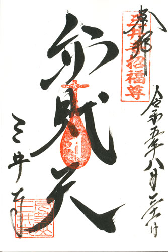 Abb.: links: Otsu, Präfektur Shiga, Tempel Miidera (Onjo-ji), Bimyo-ji, drittes Goshuin von dreien, Mittelspalte: Ki-fudou-son, rechte Spalte unten: Datum: Do, 31.8.2023 = Reiwa 5 nen hachi-gatsu san-juu-ichi-nichi. Abb. rechts: Otsu, Präfektur Shiga, Tempel Miidera (Onjo-ji), Suikan-ji, erstes Goshuin von vieren, Mittelspalte: Yakushi Nyorai, rechte Spalte unten: Datum: Do, 31.8.2023 = Reiwa 5 nen hachi-gatsu san-juu-ichi-nichi.