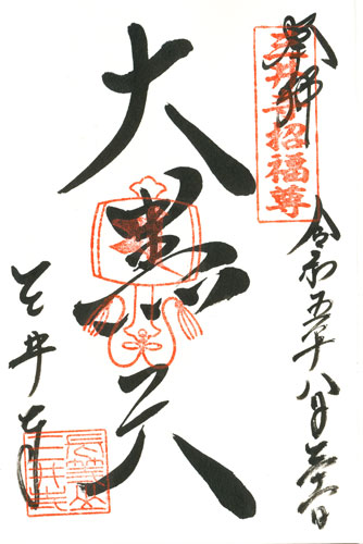 Abb.: links: Otsu, Präfektur Shiga, Tempel Miidera (Onjo-ji), Suikan-ji, zweites Goshuin von vieren, Mittelspalte: Benzaiten, rechte Spalte unten: Datum: Do, 31.8.2023 = Reiwa 5 nen hachi-gatsu san-juu-ichi-nichi. Der rote Stempel mit der Laute gibt das typische Musikinstrument der Gottheit wieder. Linke Spalte: Mii-dera. Abb. rechts: Otsu, Präfektur Shiga, Tempel Miidera (Onjo-ji), Suikan-ji, drittes Goshuin von vieren, Mittelspalte: Daikokuten, rechte Spalte unten: Datum: Do, 31.8.2023 = Reiwa 5 nen hachi-gatsu san-juu-ichi-nichi. Der rote Stempel mit dem Glückshammer gibt ein typisches Attribut der Gottheit wieder. Linke Spalte: Mii-dera.