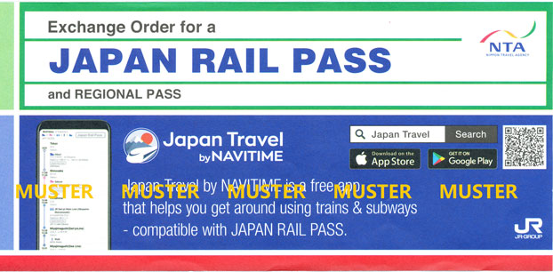 Abb.: Muster eines Gutscheines für einen JR Rail Pass, Aussehen 2023