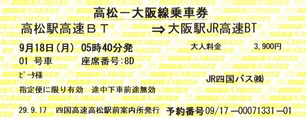 Abb.: Beispiel für ein Busticket eines Überlandbusses. Die zweite Zeile enthält Start und Zielstadt, hier von Takamatsu (die ersten beiden Kanji der ersten Gruppe) nach Osaka (die ersten beiden Kanji der zweiten Gruppe), BT ist Bus Terminal, JR bedeutet JR-Bahnhof der Zielstadt. Das dritte Kanji-Zeichen in beiden Ortsangaben steht für "eki", Bahnhof. Die dritte Zeile gibt Datum, Abfahrtszeit und Preis an. In der vierten Reihe ist der mit der Buchung verbundene Sitzplatz vermerkt.