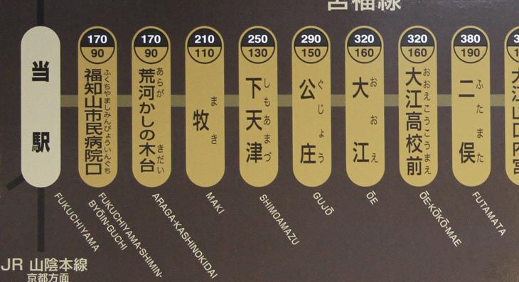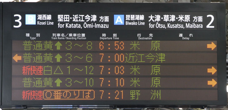 Jede Gesellschaft und jede Linie hat dazu ein eigenes System von langsamen und schnellen Zügen. Auf der Keihan Main Line beispielsweise gibt es die Local-Züge (Futsuu), die überall halten, die Semi-Expresse (Kukan Kyuukou), die Expresse (Kyuukou), die Sub-Expresse (Junkyuu), die Rapid Expresse (Kaisoku Kyuukou) und die Limited Expresse (Tokkyuu) und noch jede Menge Sonder-Expresse. Hier empfiehlt es sich dringend, vorher zu prüfen, ob der ausgewählte Zug auch wirklich am Wunschbahnhof hält.