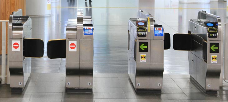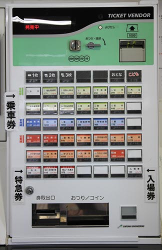 Die Ticket-Automaten folgen dem allgemeinen Grundprinzip: Auf der Anzeigetafel oben über den lindgrünen Automaten sucht man die Zielstation und den Preis. Die Automaten nehmen Cash, keine Kreditkarten. Ganz rechts oben auf dem Display befindet sich abseits von geschlossenen Tastenblock die Umschalttaste auf Englisch. Zum unteren Teil der Maschine: Im linken Teil sind vier Schlitze, davon ist der rechts oben für Scheine. Im rechten Teil ist der Münzeinwurf. Erst nach dem Geldeinwurf: Die linke Spalte im oberen Teil ist für Mehrfachtickets. Ganz oben ist Erwachsene, einfache Fahrt. Taste mit dem Zielpreis drücken Tastenblock auf dem Display, weiße und grüne Tasten. Sobald diese Taste gedrückt wird, geht es los, keine Änderungsmöglichkeit mehr. Im unteren Teil kommt links unten das Ticket raus, rechts unten das Wechselgeld. Das Ticket ist nur am Tag selbst gültig. Die Schranken funktionieren standardmäßig wie bei anderen Eisenbahngesellschaften.