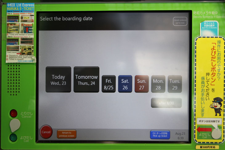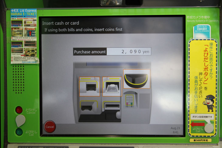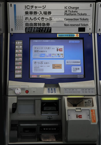 Orientieren wir uns erst einmal: Die grünen (midori) Automaten sind die richtigen. Oben gibt es den Touchscreen für die Eingabe. Unten gibt es unzählige Rein- und Raus-Fächer. Im linken Bereich kommen Tickets und Reservierungen raus oder Karten rein. Unten rechts kommen 1000 Yen-Scheine rein, darunter kommt Wechselmünzgeld raus. Dann gibt es so eine Art Mittelkonsole, oben kommen Münzen rein, darunter gibt es eine Tastatur, rechts daneben ein Scan-Feld. Und ganz rechts gibt es noch ein Scan-Feld. Ohne Railpass brauchen wir die beiden Scan-Felder und die Tastatur nicht.
