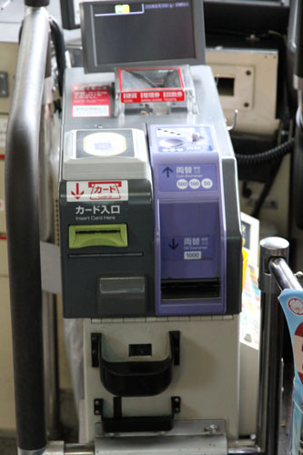 Universalmaschine im Stadtbus neben dem Fahrer: Rot umrandet ist der Münztrichter: Dort wirft man das abgezählte Fahrgeld hinein. Es gibt kein Wechselgeld. Der blaue rechte Teil ist zum Geldwechseln da. Der linke Teil ist für Karten (Suica, Pasmo....), oben NFIR, unten zum Reinstecken. Ganz unten die Münzausgabe beim Wechseln von 1000 Yen- Scheinen.