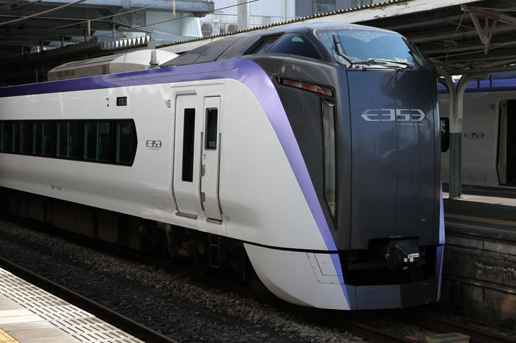 Bahnhof Matsumoto, der Limited Express Azusa 22 nach Shinjuku, Abfahrt 14:50 Uhr. Dieser Zug trägt seinen Namen nach dem Fluß Azusa in Matsumoto.