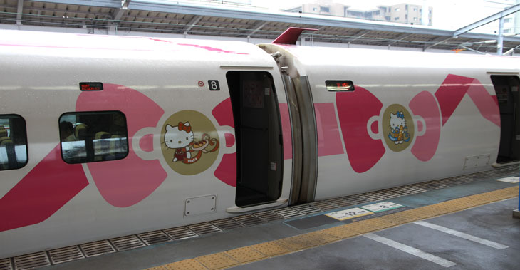 Auch die ganze Längsseite dieses Zuges ist mit Hello-Kitty-Motiven geschmückt, mit dem ikonischen rosa Band. Es ist der putzigste Hochgeschwindigkeitszug, aber die Technik ist ein ganz normaler Kodama der 500er-Serie. Der Zug fährt auf der auf der Sanyo-Shinkansen-Strecke zwischen den Städten Osaka und Fukuoka. Der Zug hält an jedem Bahnhof zwischen Shin-Osaka und Hakata, einschließlich Kobe, Okayama und Hiroshima. Da er nicht immer zur selben Zeit eingesetzt wird, muß man schon ein bißchen Glück haben, oder sich nach dem von JR online veröffentlichten Einsatzplan für den nächsten Tag richten.