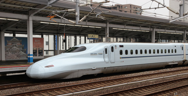 Abb.: ein Shinkansen der 700er-Serie mit schwungvoll-eleganter und super-aerodynamischer Schnauze fährt in den Bahnhof von Kyoto ein.