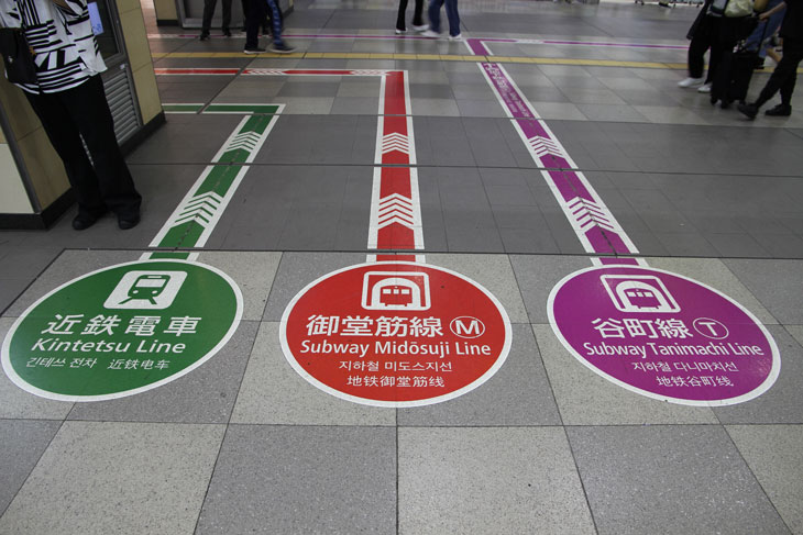 JR-Bahnhof Tennoji in Osaka: Ein ganz ähnliches Bodenmarkierungssystem leitet die Passagiere zu den verschiedenen U-Bahn-Linien und zum Kintetsu-Bahnhof.