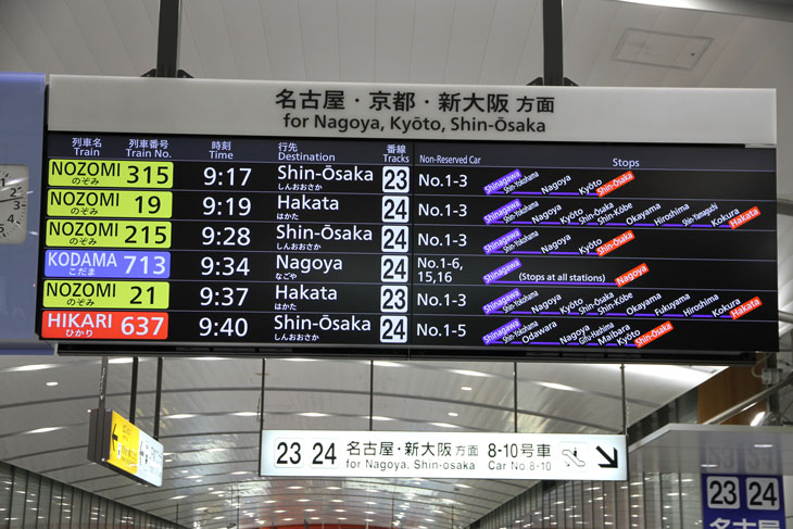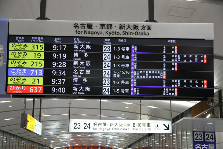 Bahnhof Shinagawa: Jeder Typ Shinkansen hat seine eigene Farbe: der superschnelle Nozomi gelb, der zweitschnellste Hikari rot und der mittelschnelle Kodama blau. Der Kodama ist der langsamste der drei Tokaido-Shinkansen; er hält an jedem Shinkansen-Bahnhof. Gelb ist für JR-Paß-Besitzer tabu.