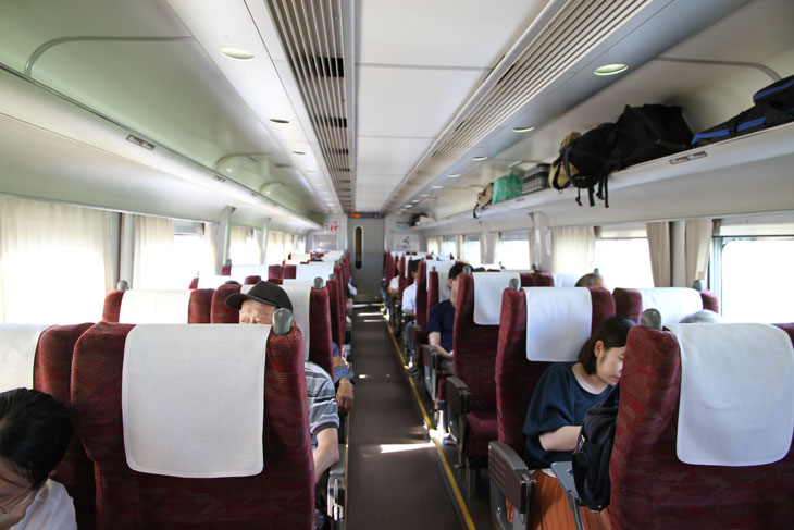 Das Innere des Yakumo Express. Dieser Zug hat nur reservierungspflichtige Plätze. Momentan (2023) gibt es insgesamt 62 dieser Züge, die die genannte Strecke mehrfach täglich abdecken. Es ist geplant, die in die Jahre gekommene 381er-Serie 2024 auf der Strecke durch die neue 273er-Serie zu ersetzen.