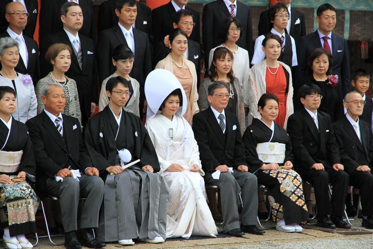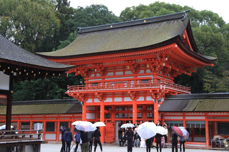 Eine Hochzeitsgesellschaft hat sich vor dem Ro-mon aufgebaut und wartet darauf, daß der Photograph seine Arbeit macht. Für Hochzeitsgesellschaften ist der Schrein nicht nur wegen der wunderschönen Kulisse beliebt, sondern auch wegen der Geschichte von Tamayori-hime-no-mikoto und ihrem Mann, die für glückliche Liebesheirat und blühende Nachkommen steht.