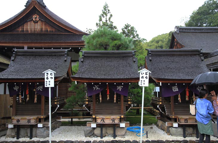 Drei Kotosha-Schreine für den Gott Okuninushi no mikoto in Reihe. Rechts liegt der innerste Bezirk mit den Hauptschreinen. Alle diese kleinen Schreine sehen wie aus einem Guß aus. Auf der weißen Tafel links sind die chinesischen Tierkreiszeichen "Affe" (die beiden linken Zeichen übereinander) und "Drache" in Hiragana angegeben (die beiden rechten Zeichen übereinander); auf der Tafel rechts sind es "Hund" (die beiden linken Zeichen übereinander) und "Hahn" (die beiden rechten Zeichen übereinander). Auf dem Holz und dem Stoff der Schreine stehen die Kanji, am linken Affe und Drache, am mittleren Hund und Tiger, am rechten Hahn und Hase.