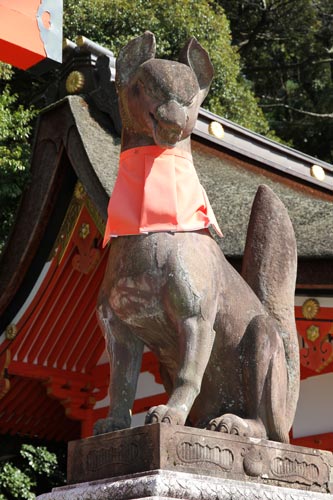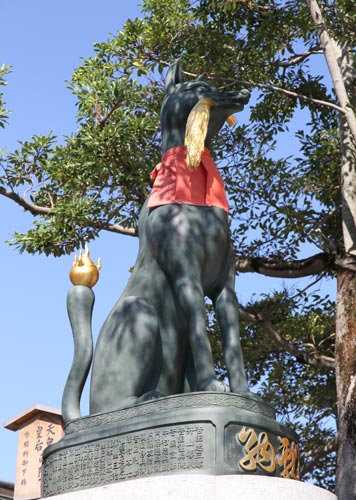 Die Fuchsstatuen tragen ein Büschel Reispflanzen im Maul. Die linke Schwanzspitze endet in einem Wunschjuwel.