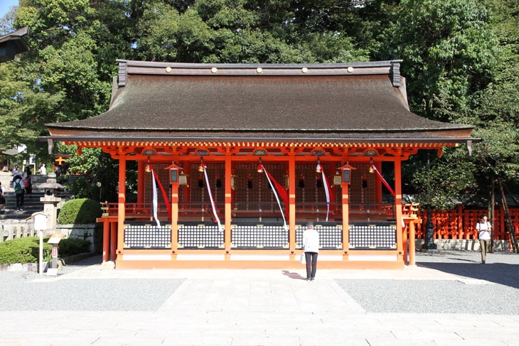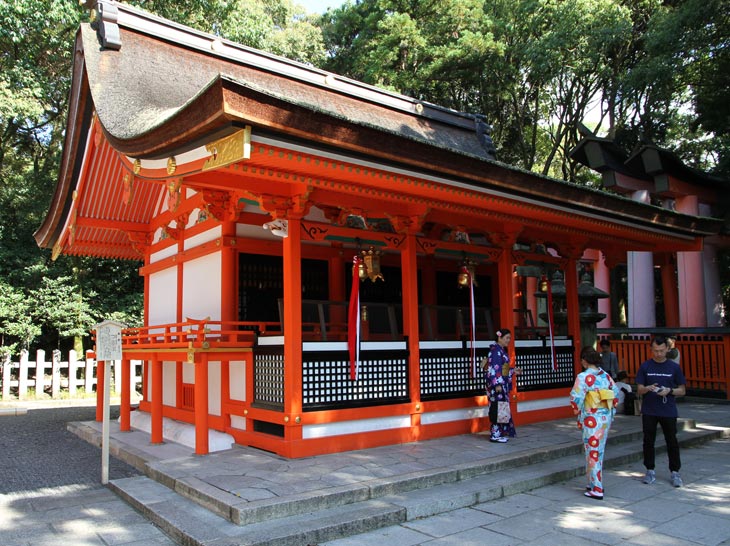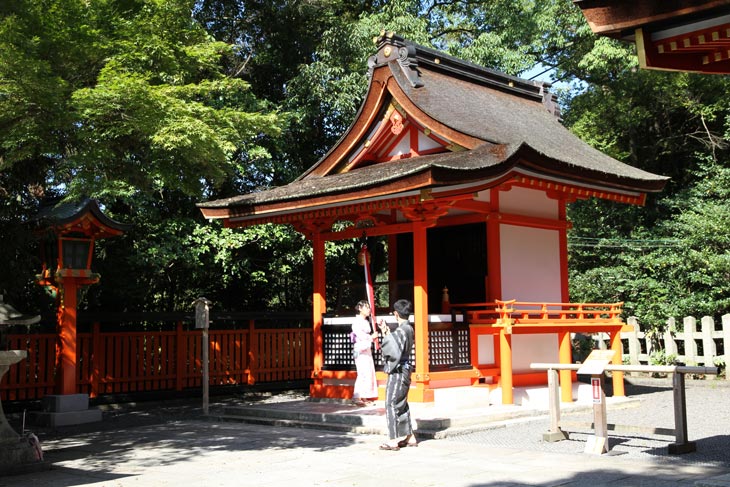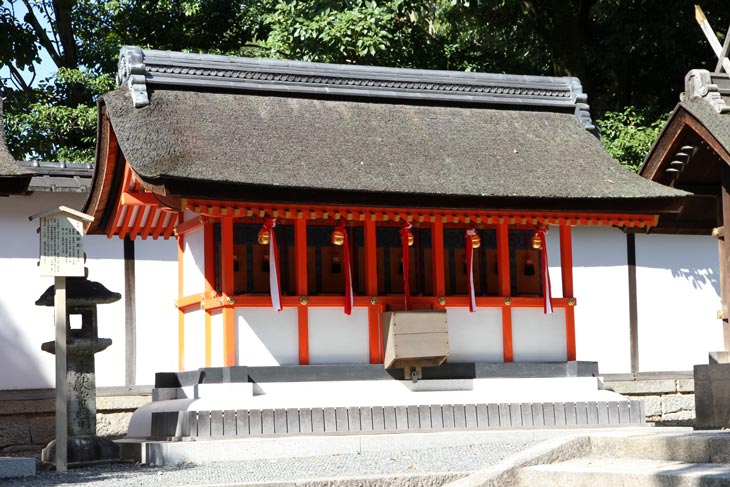 Drei kleine Nebenschreine am Fuße des Bergweges, v. l. n. r. Choja-sha, Kada-sha und Goshaaidono-sha.
