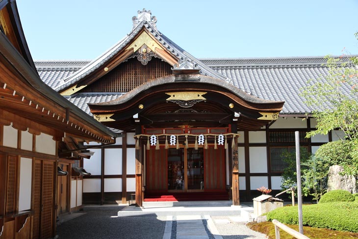 Der Blick von der Seite auf den Haupt-Honden zeigt das typisch weit vorgezogene Dach und die Asymmetrie des Gebäudes.