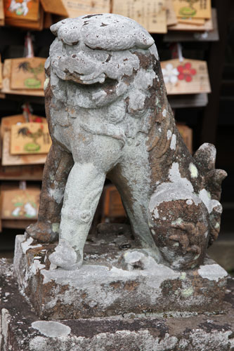 Die Ursprünge dieses Schreines liegen vermutlich in der Nara-Zeit. Hier wird als Hauptgottheit Oyamatsumi-no-kami verehrt, ein Kind von Izanagi-no-mikoto und der ältere Bruder von Amaterasu. "Kami" bezeichnet eine Shinto-Gottheit, "O" ist das Honorativ-Präfix, und "yama" bedeutet Berg, also heißt "Oyamatsumi-no-kami" Gottheit des Großen Berg-Herren. Auch einfache Berggeister werden im Shinto als Yamatsumi bezeichnet. Sein Hauptschrein steht auf der Insel Omishima. Dieser oberste Berggott hatte Konohana-sakuya-hime ("die wie Blüten eines Baumes blühende Prinzessin") zur Tochter, die Ninigi-no-Mikoto (= Tensonkorin) heiratete. Einen Tag nach der Hochzeit kam der erste Enkel zur Welt, und diese Hochgeschwindigkeits-Schwangerschaft ist der Grund dafür, daß an diesem Schrein für eine einfache und leichte Geburt gebetet wird. Ninigi wurde der Urgroßvater des Kaisers Jimmu und ist damit Vorfahr aller japanischen Kaiser, und er war es, der von Amaterasu die drei japanischen Throninsignien erhielt, Schwert, Spiegel und Halskette.