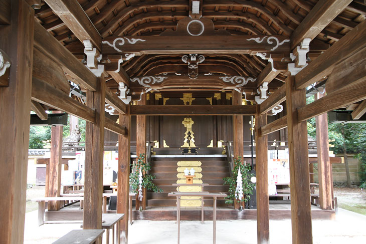 Nach Durchschreiten des spät-Edo-zeitlichen, 1828 erbauten Ro-mon (Rou-mon, "Turm-Tor"), in dessen Obergeschoß sich bereits die Fässer gespendeten Sakes ostentativ stapeln, darunter solche der bedeutendsten Hersteller des Landes, gelangt man in gerader Linie zum Kaguraden, der offenen Halle, die zentral mitten auf dem Platz steht, von allen Seiten offen und zugänglich, und als Haiden (Anbetungshalle) dient. Das gegenwärtige Gebäude stammt aus dem Jahr 1828 und ist damit spät-Edo-zeitlich.