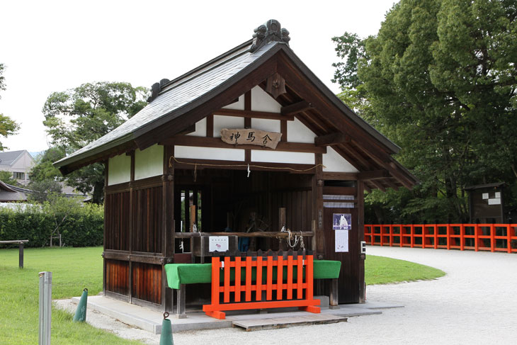 Links des Weges folgt auf dem Weg zum zweiten Torii ein kleines Gebäude, der Shinmesha (Jinmesha), ein Stall für das heilige weiße Pferd des Schreines, das man manchmal hier sehen kann. Galt es früher als Mittel, um Botschaften zu den Göttern zu bringen, ist es heute eher das Maskottchen des Schreins. Vielleicht geht das Pferd auch auf einen alten Opferbrauch zurück. Heute jedenfalls stehen Besucher Schlange, um es mit zuvor gekauften Möhren zu füttern. Dahinter gibt das zinnoberrot angestrichene Ni-no-Torii den Zugang zum eigentlichen Schreinbereich frei.