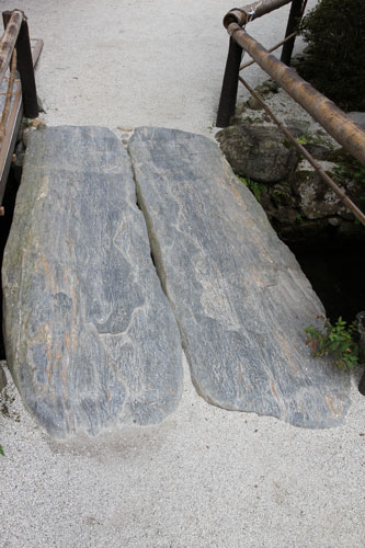 Abb. links: Choju-bashi = Kusunoki hashi = Mitarai kawanikakaru hashi. Abb. rechts: Romon.