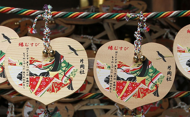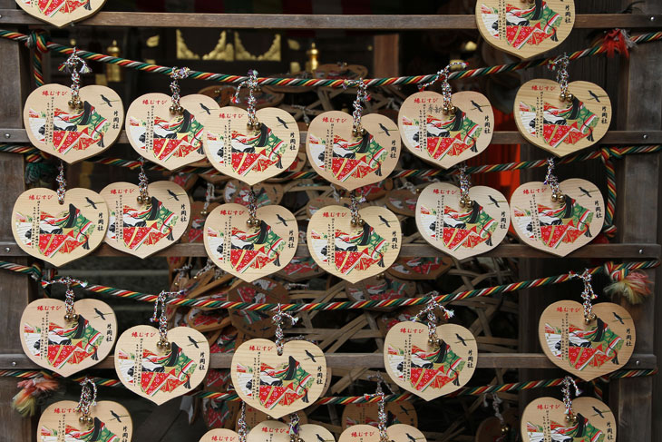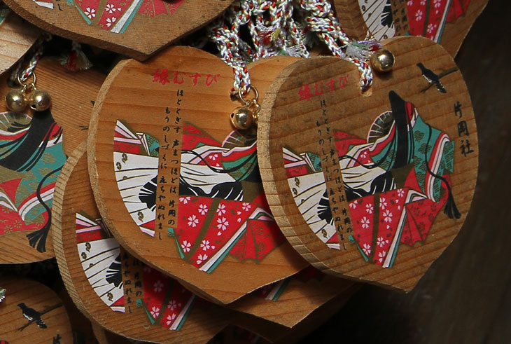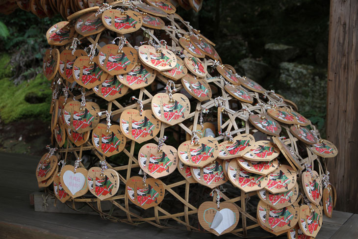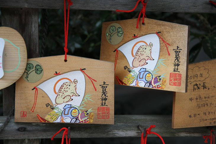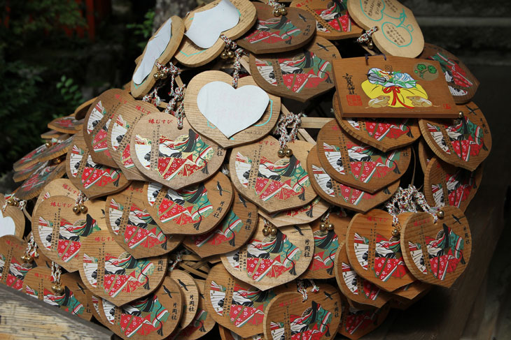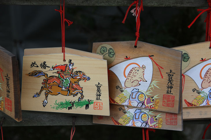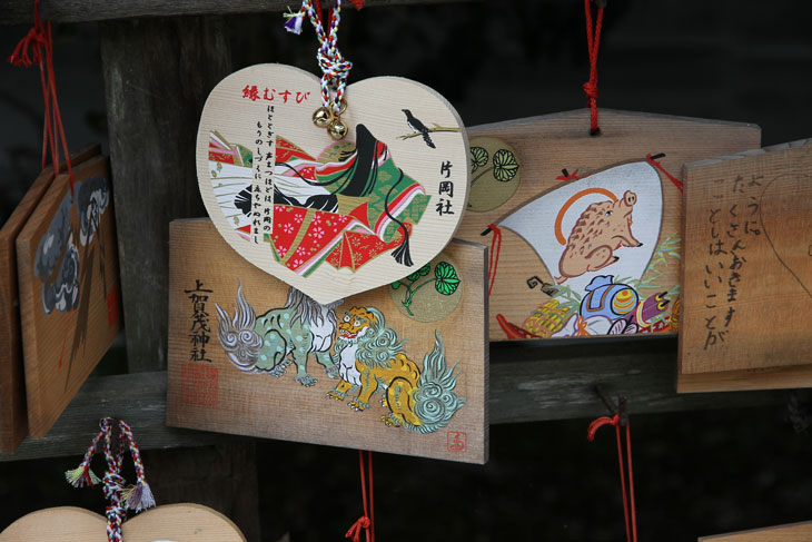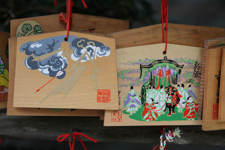 Am Schrein gibt es u. a. Ema (Votivtäfelchen) in der Form einer legendären dreibeinigen Krähe (Yatagarasu, bedeutet soviel wie "Krähe mit 8 = vielen Füßen"), die als Gesandter der Kami dem legendären ersten Kaiser Jimmu bei der Eroberung Japans den Weg wies. Krähen gelten an diesem Schrein als heilig. Andere Ema aus Holz scheinen eine Herzform zu haben, doch das ist nicht zutreffend, vielmehr handelt es sich um Haselwurz-Blätter (Asarum sp., Aristolochiaceae). Zwei dieser Blätter bilden das Wappen (Ka-mon) des Schreines, und an manchen Giebeln sieht man dieses Motiv. Hier ist nur die äußere Form dem Blatt angeglichen, die Flächen sind vorne bunt bemalt und hinten zum Beschriften mit Wünschen vorgesehen. Die Zettelchen der Glückslose (von "großem Glück" bis zu "großem Pech", Omikuji) werden mit kleinen weißen Pferden als Halterung verkauft, alles typisch "kawaiiiiii" (süß, niedlich), und eine gute Einnahmequelle für den Schrein, denn jedes Ema kostet ca. 4 Euro (500 Yen).