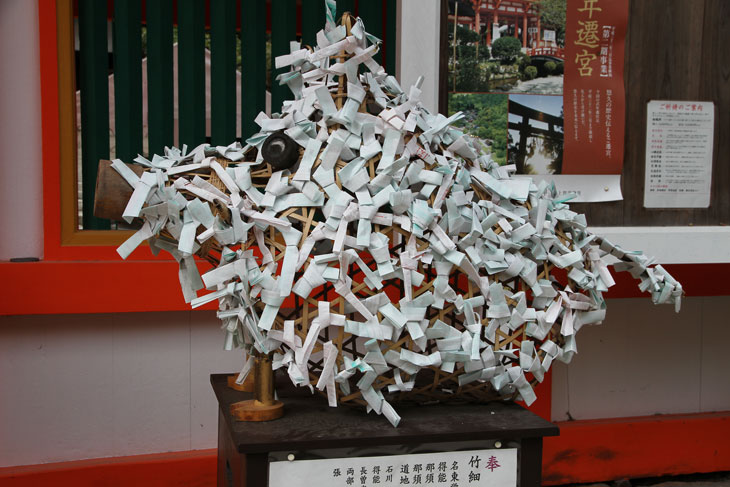 Omikuji an einem Gestell, das einen Eber symbolisiert