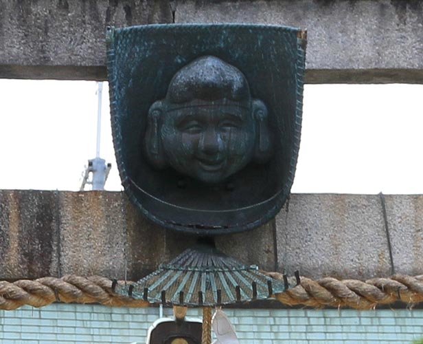 Konterfei des Glücksgottes Ebisu am zweiten Torii. Gläubige werfen hier Münzen hoch und versuchen, die beiden Netze zu treffen.