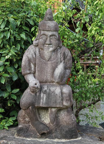 Zwei verschiedene steinerne Statuen des Glücksgottes Ebisu.