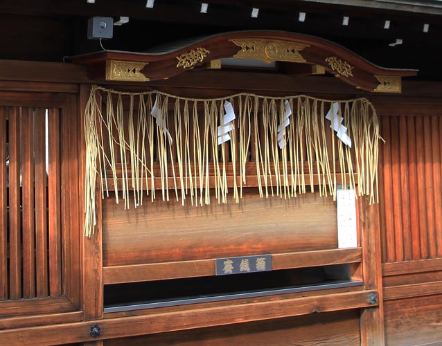 Blick auf die Opferhalle des eigentlichen Heiligtums. Im Heiden liegt innen rechterhand eine riesige Trommel. Heiden = Opferhalle eines Shinto-Schreines, normalerweise in derselben Achse wie Honden und ggf. Haiden angeordnet. In einem Heiden werden den Gottheiten (Kami) die Opfergaben (Heikaku) dargebracht. Die täglichen Besucher bleiben aber vor der hölzernen Schranke.