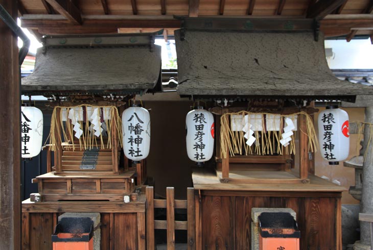 Zwei Nebenschreine, selbst noch einmal überdacht. Links befindet sich der Yawata-jinja, rechts der Sarutahiko-jinja.