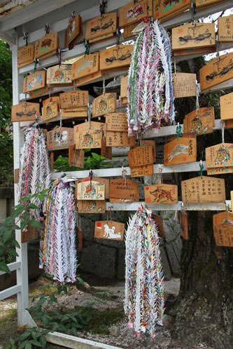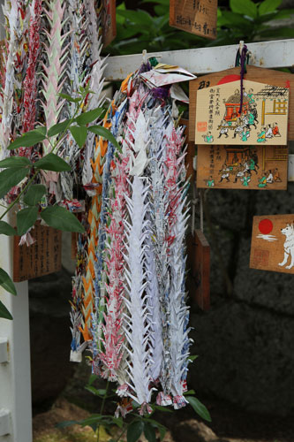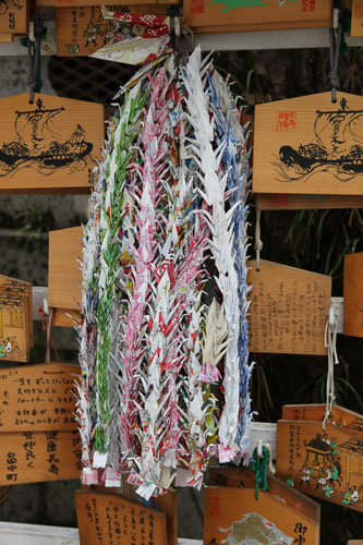 Büschel aus Origami-Ketten mit unendlich vielen Tsuru (Kranichen) am Ema-Gestell