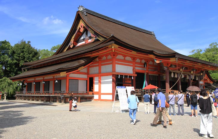 Der Schrein ist in Süd-Nord-Richtung aufgebaut mit drei in Achse liegenden Gebäuden, dem über eine Treppenanlage zugänglichen, zweistöckigen, orangerot-weiß gestrichenen Südtor vom Typ Romon (Roumon), der allseits offenen Tanzplattform (Maidono, Kagura-den) am Kreuzungspunkt der Wege und dem eigentlichen Schrein im Norden, der eine Kombination aus Honden (inneres Heiligtum) und Haiden (Opferhalle) ist. Im Westen befindet sich ein weiteres, ebenso zinnoberrot gestrichenes Tor, das in Achse mit dem Honden steht und ebenfalls zweistöckig gebaut ist; der Weg jedoch verläuft nicht gerade auf jenen zu, sondern führt in einer Kurve auf den zentralen Platz mit der offenen Halle. Ungewöhnlich für einen Schrein ist, daß sich in den beiden Seitenkompartimenten Wächterfiguren (Zuijin-Kriegerfiguren, auch: Zuishin) befinden. Diese Wächtergottheiten werden als Kadomori-no-kami betrachtet, also als Götter, die über die Toröffnungen wachen. Typischerweise werden sie mit Pfeilen und Bogen dargestellt. Sie sind die Shinto-Entsprechung der Nio in Tempeltoren. Im einzelnen werden sie als Yadaijin (Minister mit Pfeilen) und Sadaijin bezeichnet. Typischerweise wird Sadaijin, schwarz gekleidet, als älterer Herr mit Silberbart und mit offenem Mund dargestellt, Yadaijin als jüngerer Mann mit geschlossenem Mund, rot gekleidet. Beide tragen Hoftracht mit einer Robe mit extrem weiten Ärmeln, Kenei no kanmuri als hochgesteckte Haartracht mit Oikake. Beide tragen ein Schwert. Ein solches Tor wird auch als Zujin-mon oder als Yadaijin-mon bezeichnet. Ganz ähnlich finden wir das im Matsunoo-Taisha und im Goryo jinja (Kamigoryo jinja), beide ebenfalls in Kyoto. Das auffälligste Merkmal der Tanzplattform sind Hunderte von Papierlaternen in mehreren Reihen, die abends leuchten und die den Namen der Geschäftsleute tragen, die für den Schrein gespendet haben.