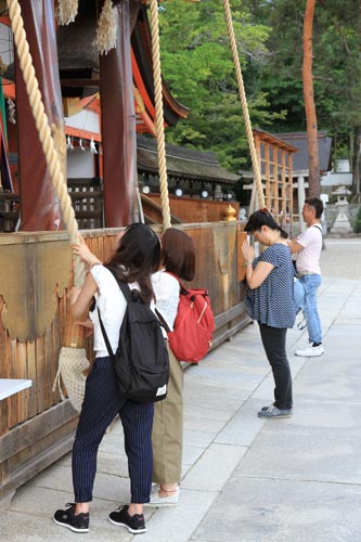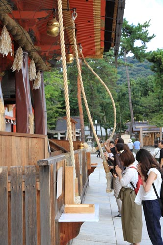 Mit den Seilen bringen die Betenden die oben befestigten Schellen zum Läuten, um den Göttern ihre Anwesenheit mitzuteilen. Danach, wenn man sich der Aufmerksamkeit der Kami gewiß ist, bringt man sein Gebet vor.