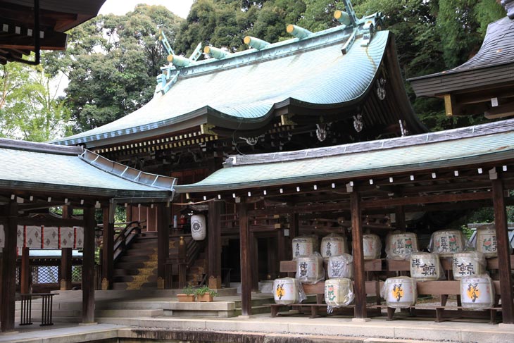An dem Honden sehen wir zwei typische Merkmale der Shinto-Architektur: Katsuogi = Kasoegi = Querbalken auf dem Dachfirst, ursprünglich zur Beschwerung des Reets, danach nur noch symbolisch. Diese kleinen Querbalken liegen waagerecht oben auf dem Firstbalken quer zu diesem, wie bei einer Leiter mit nur einem Mittelholm. Querschnitt meistens rund und beiderseits nach außen etwas konisch verjüngt, außer beim Sumiyoshi- und Otori-Typ, dort rechteckig. Sind immer vorhanden bei den Grundtypen Shinmei-zukuri, Kasuga-zukuri, Sumiyoshi-zukuri und Taisha-zukuri. Ursprünglich ein Merkmal kaiserlicher Palastarchitektur, dann von den mächtigsten Familien für ihre Häuser mit kaiserlicher Erlaubnis übernommen, schließlich in der Schreinarchitektur angekommen. Die Reihe beginnt in der Regel erst hinter den Chigi. Die Anzahl variiert. Bei hochangesehenen Schreinen werden die Enden mit bronzenen, kupfernen und/oder vergoldeten Kappen zum Schutz vor Verwitterung versehen.