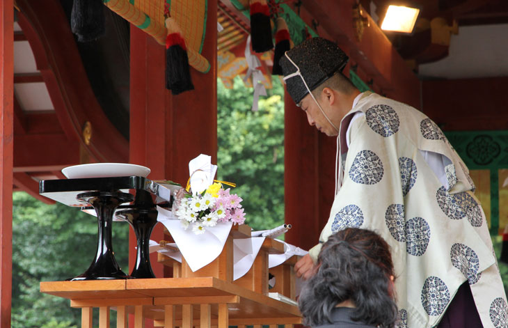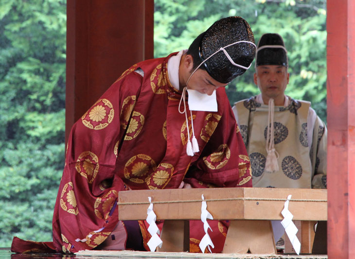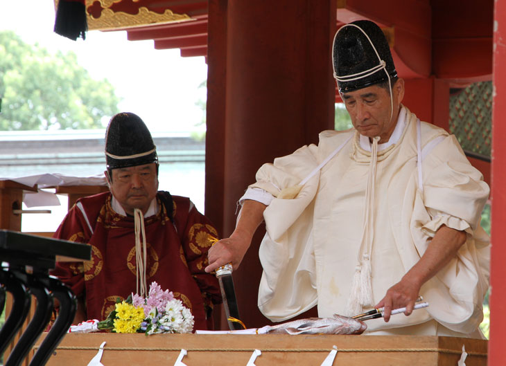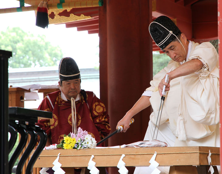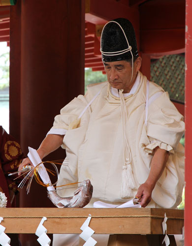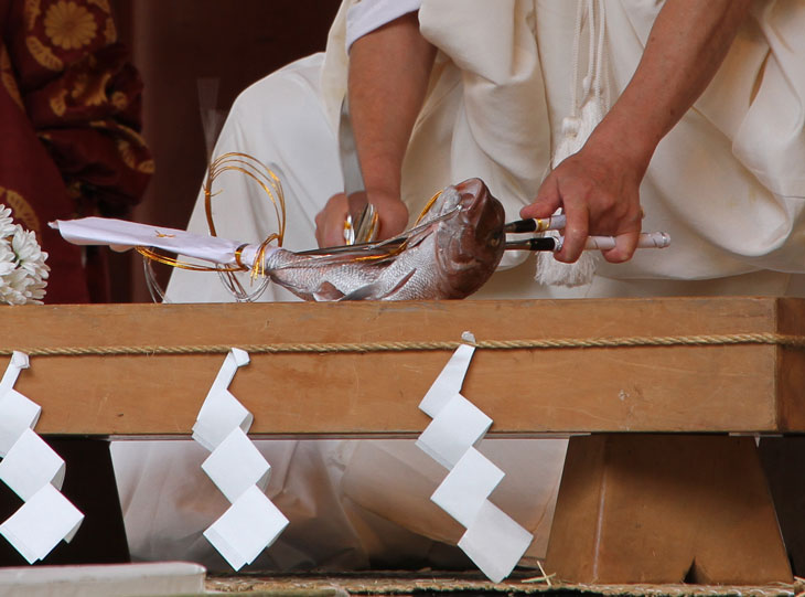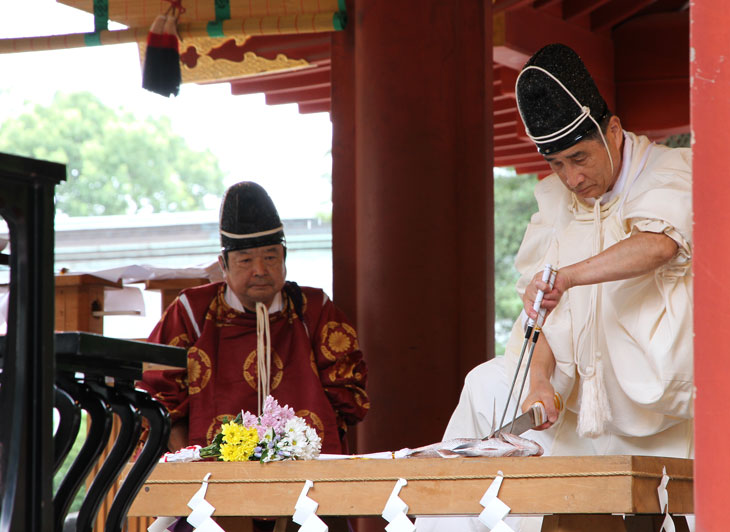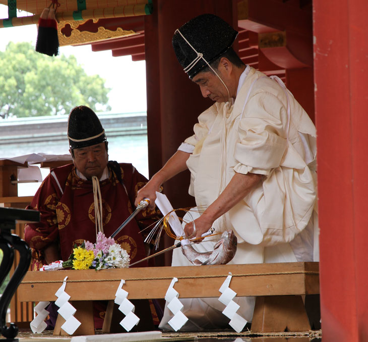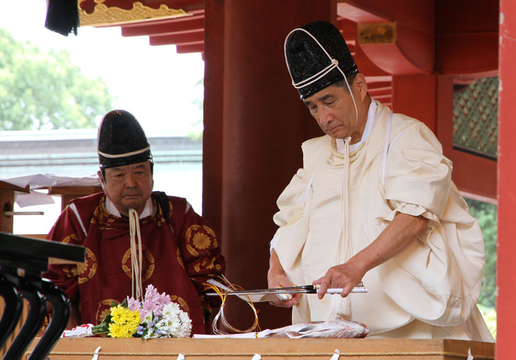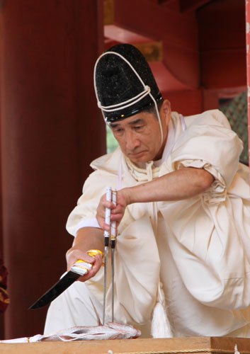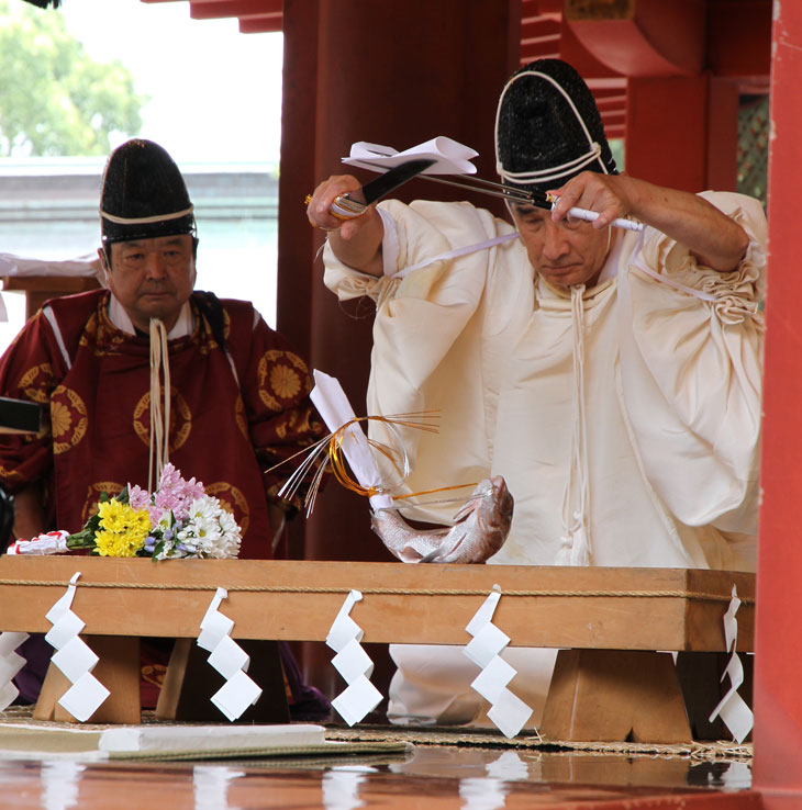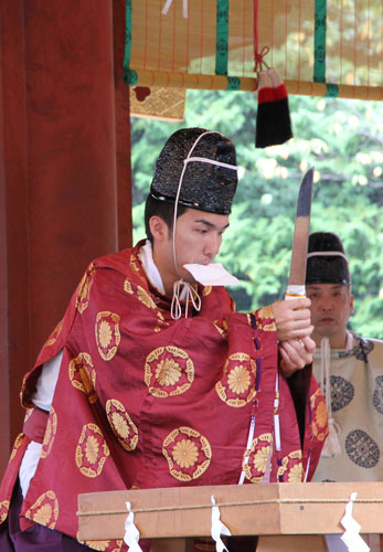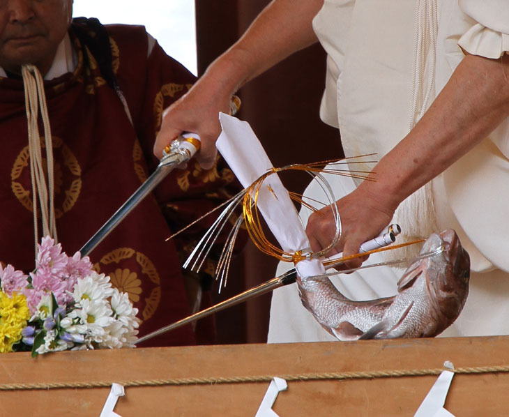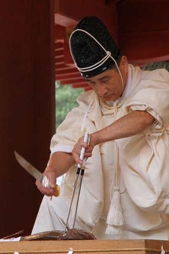 Das hier in Bildern gezeigte Ritual heißt Hocho-shiki (Houchou-shiki) und ist eine traditionelle, 1000 Jahre alte japanische Küchenmesser-Zeremonie. Das Ritual Hocho-Shiki fand seit der frühen Heian-Zeit am kaiserlichen Hof statt. Das Ritual ist eine Opferzeremonie und hat ihren Ursprung in der Hofküche Yusoku Ryori (Yuusoku Ryouri). Das Wort Hocho für Küchenmesser wurde früher mit einem anderen Kanji als heute geschrieben. Das alte Kanji hatte die Bedeutung "Restaurantküche". Dieses Zeichen wird heute für den "Koch" selbst verwendet. Der Name des Messers und des Kanji kommt aus China und leitet sich ab von einem berühmten Koch dieses Namens Hocho, der für seine Meisterschaft im Umgang mit Messern berühmt war. In feierlicher Atmosphäre wird ein ganzer, ungeschnittener Fisch, der als Opfergabe für den Kami bestimmt ist, mit einem zeremoniellen Messer (Hocho, Houchou) in der rechten und den großen, metallenen Mana-Eßstäbchen (Mana-hashi, Manabashi) in der linken Hand ohne direkte Berührung zubreitet, mit stark ritualisierten, formalisierten und sparsamen Bewegungen. In jeder einzelnen Bewegung der Zubereitung und in der Schnitt-Technik drückt sich fachkundige Meisterschaft aus. Jede einzelne Bewegung erscheint dem Betrachter bedeutungsgeladen und kraftvoll. Das Messer selbst ist wie ein kurzes japanisches Schwert geformt, besitzt aber keine Tsuba. Die Kunst besteht darin, beim Schneiden keinen Knochen zu treffen. Diese historische Messer-Zeremonie, die früher Teil der höfischen Kochkunst war, wird heute nur noch bei besonderen Anlässen zelebriert, bei Kulturveranstaltungen, in Museen oder wie hier bei Schrein-Ritualen. Der ausführende Meister trägt das traditionelle Gewand der Shinto-Priester (Hitatare-Robe, weißes Kariginu) mit entsprechender Kopfbedeckung (Eboshi-Mütze). Zu Anfang binden seine Assistenten die weiten Ärmel mit am Gewand befestigten Schnüren hoch, damit sie nicht beschmutzt werden. Da die Durchführung sehr anstrengend ist, wischen die assistierenden Priester regelmäßig dem Ausführenden den Schweiß von der Stirn. Während der ganzen Zeremonie wird der Fisch zu keinem Zeitpunkt mit den Händen berührt, während er auf dem Holzbrett mit den überdimensioniert wirkenden Kochutensilien zerkleinert wird. Da die Speisen für den Kami bestimmt sind, würden sie durch eine Berührung mit der Hand verunreinigt werden; Gleiches galt früher in der Hofküche, wenn die Speisen für den Kaiser bestimmt waren. Die Kunst dieses Rituals wird auch als Hocho-do (Houchou-dou) bezeichnet, der Weg des Küchenmessers. Nach Beendigung der Zeremonie werden die kunstvoll präparierten Stücke der Dorade dem Kami zum Opfer dargebracht. Im Shinto-Kontext ist die ganze Zeremonie eine Opfergabe an den Kami.