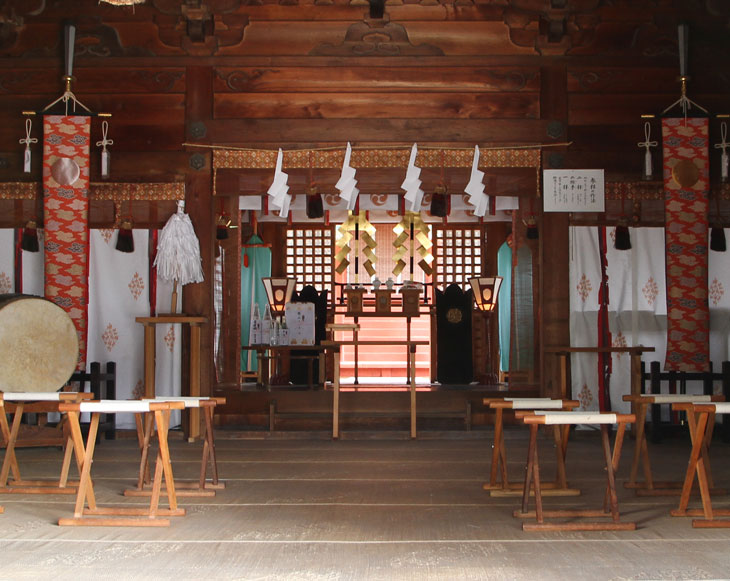 Die hier verehrte Gottheit ist Ame-no-uzume-no-mikoto. Gemäß Shinto-Mythologie hatte sich einst die Sonnengöttin Amaterasu in eine Höhle zurückgezogen, aus Zorn über das Treiben ihres Bruders, des wilden Sturmgottes Susanoo. Die Welt blieb ohne Sonnengöttin dunkel, und die anderen Götter suchten nach einem Weg, die Sonne aus ihrem Versteck herauszubekommen. Die Göttin Ame-no-uzume vollführte draußen einen spontanen Tanz, um Amaterasu aus der Höhle herauszulocken. Der Tanz und die Darbietung inclusive Striptease-Entblößung brachte die versammelten Götter zum Lachen, und schließlich wurde die Sonnengöttin neugierig, was da draußen abging. Sie wagte sich ein wenig heraus, und in dem Moment machte ein anderer Gott die Höhle zu, daß sie nicht mehr zurück in ihr Versteck konnte. Ame-no-uzume ist damit die älteste überlieferte Tänzerin und wird daher als Begründerin der Tanzkunst und der darbietenden Unterhaltungsindustrie sowie als Schutzgöttin der Tänzer verehrt. Auch die Entstehung des Kagura-Tanzes im Shinto-Kult wird auf dieses mythologische Ereignis zurückgeführt. Ihr männliches Gegenstück ist Sarudahiko Oukami, manchmal werden sie auch als Mann und Frau angesehen. Auch er wird in diesem Schrein verehrt. Schauspieler und in der Unterhaltungsindustrie Tätige suchen diesen Schrein auf, um für eine Verbesserung ihrer Fähigkeiten zu beten. Außerdem ist dieser Schrein der Wächter-Schrein der Familie Ii, der ehemaligen Daimyo-Familie auf dem Lehen Hikone.