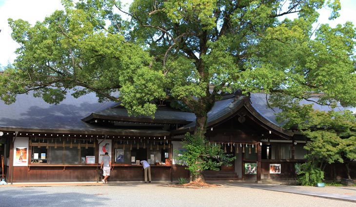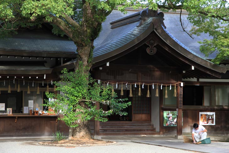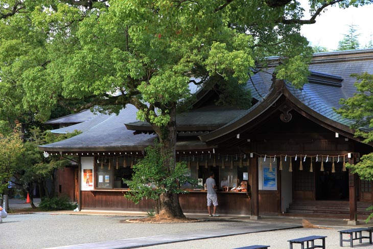 Blick von Süden auf die Haupteinheit. Das Dach des eigentlichen, nur Priestern zugänglichen Schreines ist hinter dem Dach der Andachtshalle verborgen.