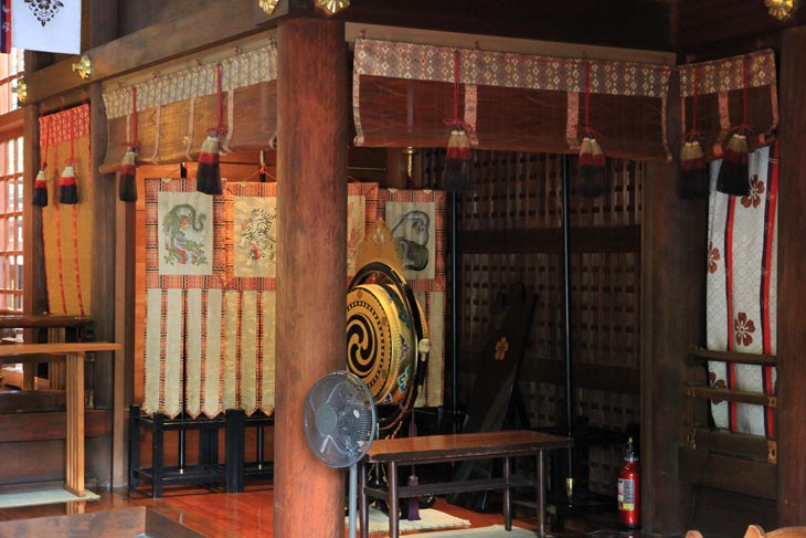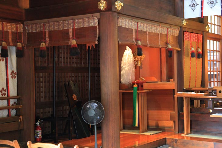 Innenraum rechts, mit einem Haraegushi zur kultischen Reinigung, einem Wedel mit Papierstreifen. Der Priester schwingt diesen Wedel über Objekte oder Personen, die rituell gereinigt werden sollen.