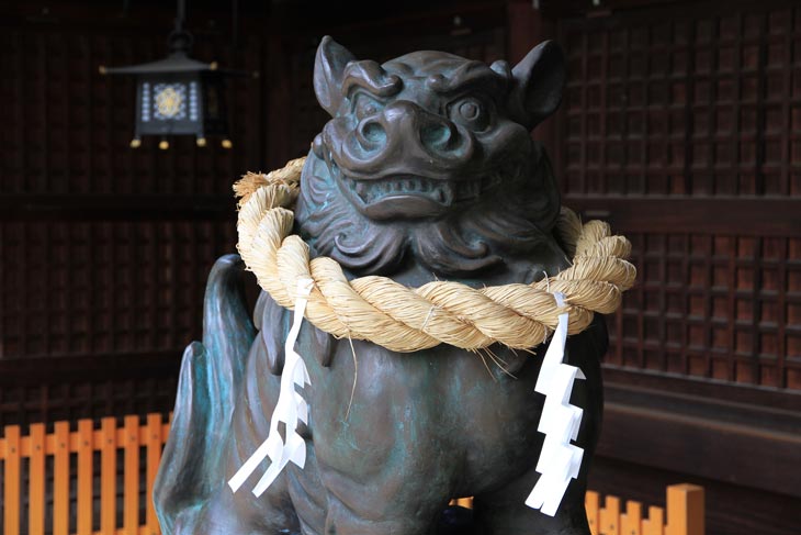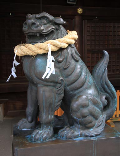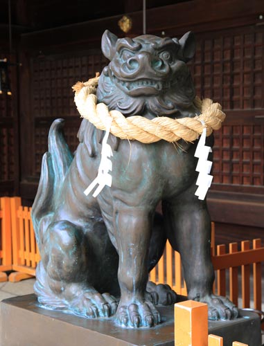 Detail des linken Komainu. Beide tragen ein Shimenawa mit Shide um den Hals.
