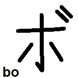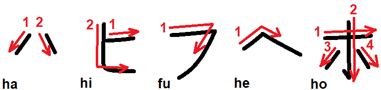 Ohne die "zwei kleinen Striche rechts oben" (Dakuten, Nigori, Ten-ten) wird die Silbe mit H ausgesprochen, mit den Strichen stimmhaft mit B. So können aus jedem H-Zeichen die B-Silben durch Hinzufügung der beiden Striche erzeugt werden. Alle fünf Silben werden mit B ausgesprochen, die Ausnahme FU betrifft nur die H-Serie.