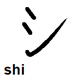 Beim SHI ist es wichtig zur Unterscheidung vom TSU: Man schreibt senkrecht von oben nach unten und biegt dann mit dem langen Strich wieder nach oben. Dabei bilden die Anfangspunkte aller drei Striche eine Senkrechte. Der lange Strich geht nicht bis ganz nach oben, wenn man die Oberkante verbindet, entsteht ein schräger Strich, kein horizontaler. Beim TSU ist es andersherum.
